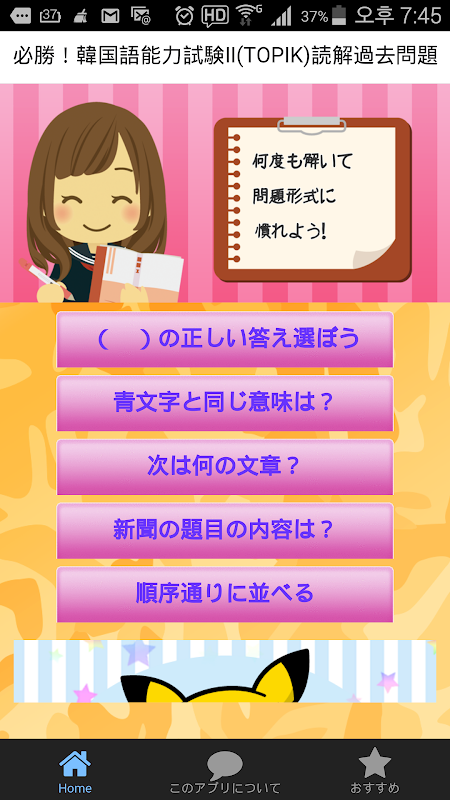 *当アプリは、韓国語能力試験を受ける人に役に立とうと作られた無料アプリで、韓国語能力試験の公式なアプリではありません。