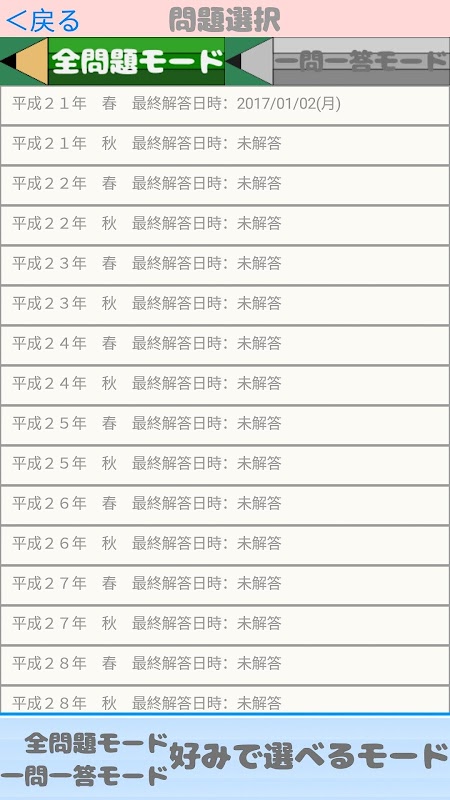 ・「全問題モード」「一問一答モード」の選択可能