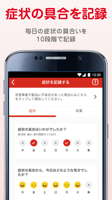 「疲労」「関節のこわばり」「痛み」といった毎日の症状の具合いをスライダーで選択し、0~10までの11段階で記録することができます。