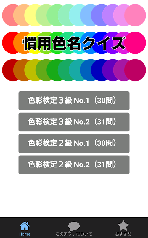慣用色名に関するクイズです。色彩検定試験を受ける方の勉強用に!美術やデザイン系に興味がある方の参考用にも!すきま時間にクイズで覚えられるアプリです。
