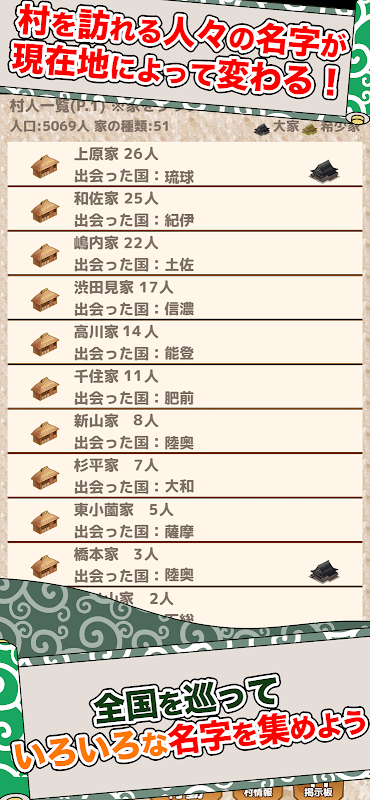 Com base nas informações de localização do dispositivo, pessoas com sobrenomes encontrados na área irão até a aldeia. Viaje pelo país e reúna vários aldeões.