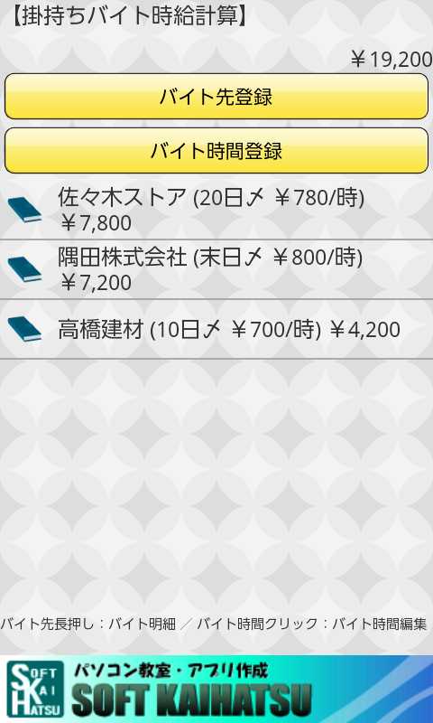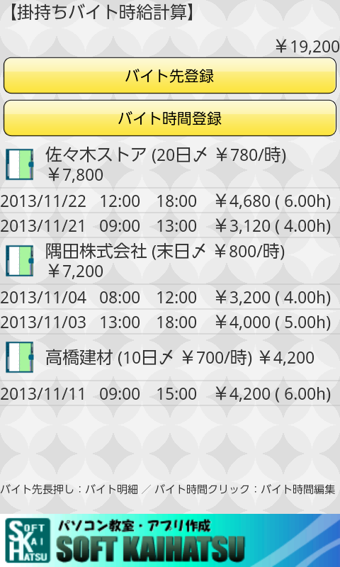 ・バイト先別一覧表で各〆毎に合計金額と時間を表示しました