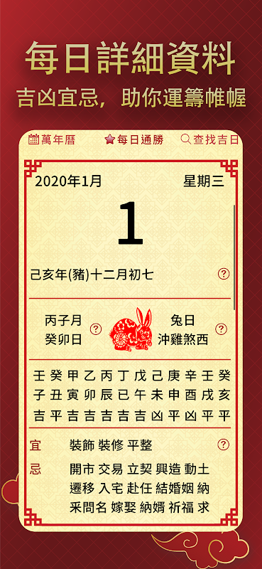 ・Horas de boa e má sorte: De acordo com as 12 horas como Zichou, Yinmao e assim por diante, os bons e os maus momentos são exibidos. À primeira vista, fica claro como evitar o azar e escolher a boa sorte.