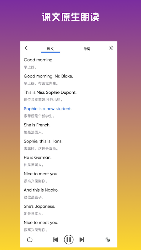 1. Parte de áudio: bilíngue em chinês e inglês, você pode optar por exibir apenas chinês/inglês e pode reproduzir o artigo inteiro ou uma única frase em loop.