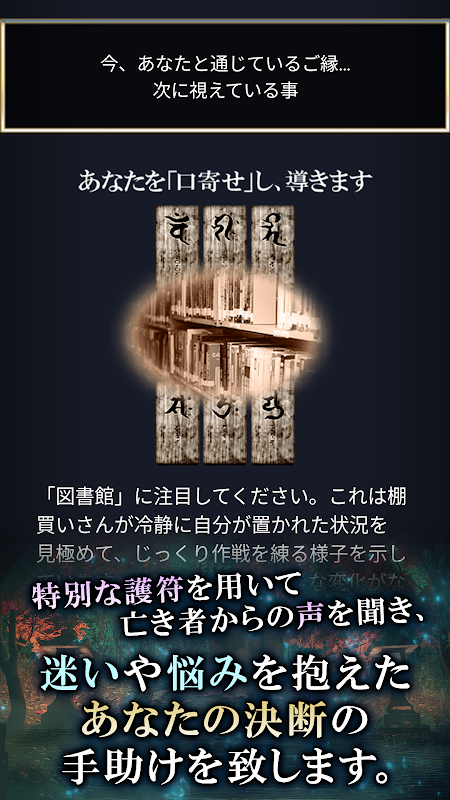 “Kuchiyose” é algo que conecta o outro mundo com este mundo e entrega essa voz através da alma. Mesmo que você não consiga ver, os espíritos e os espíritos com quem você tem uma conexão profunda o cercam e o protegem. Vou desvendar as palavras que o espírito transmite e te mostrar o caminho para te salvar.