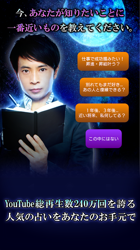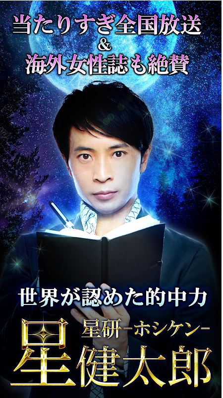 星健太郎が星の研究を通じて作った「ホシ研」をあなたのお手元でご堪能下さい。パワフルな鑑定力と、圧倒的な的中力。絶大なる人気を誇る占いをお楽しみいただけます。