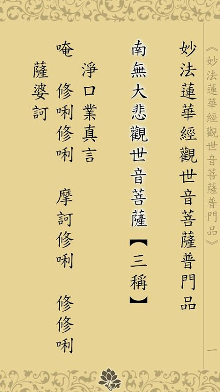 本程式提供了經咒念誦的功能,並且於每個章節經句章節細心的引導你,免除了紙本經本使用上,初發心的菩薩們常會遇到的問題,如跟不上、找不到等等的問題影響持誦的順暢。