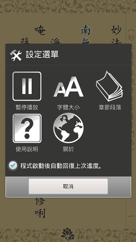 系統設計上除了念誦位置引導、自動翻頁、字體大小調整,也提供了次頁銜接的預覽功能,每頁最後一句為次頁的第一句,如此在翻頁時減少了視覺上或意識上經句銜接上的問題。更多的小細節還需要您下載使用體驗!