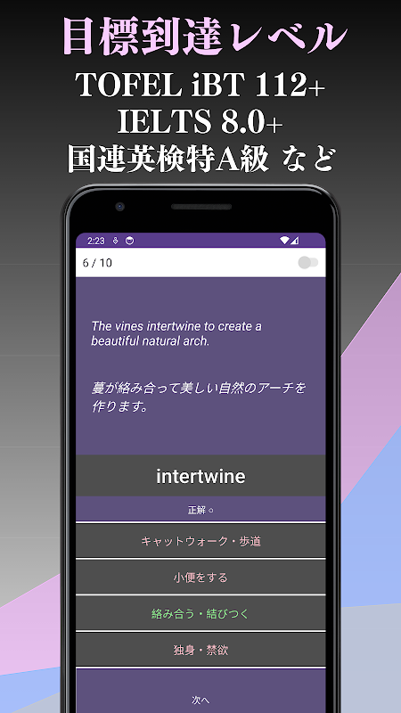 * É totalmente um aplicativo de palavras em inglês para usuários avançados de inglês. Nível CEFR C2, IELTS8.0 ~ 9.0, TOFEL iBT 112 ~ 120, United Nations Eiken Special Class A, Cambridge Eiken CPE. Recomendado para quem deseja ler jornais em inglês sem problemas e para alunos avançados de inglês que desejam preencher a lacuna com nativos de língua inglesa.