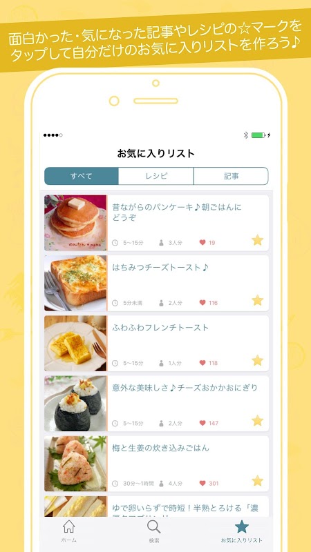 Você pode registrar suas receitas e artigos favoritos que deseja ler mais tarde na "lista de favoritos" com um único toque. É conveniente porque você pode verificar o que tem em estoque mais tarde.