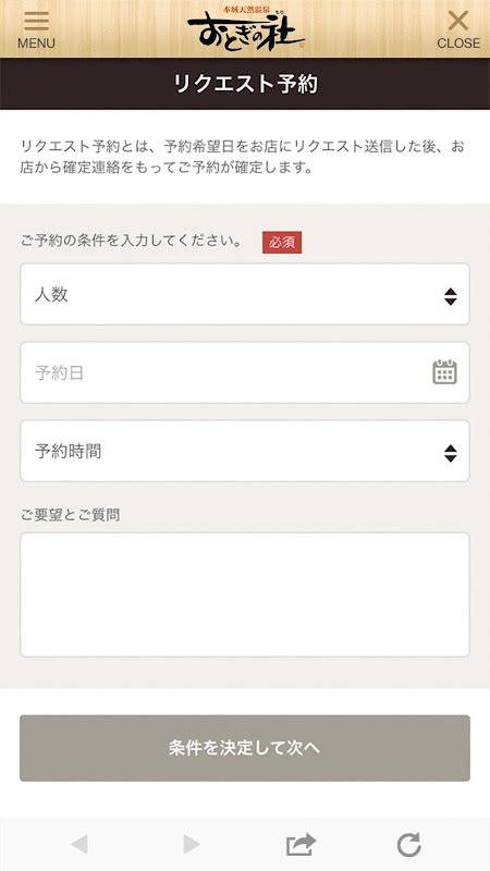 Você pode solicitar uma reserva simplesmente especificando o número desejado de pessoas e a data e hora.