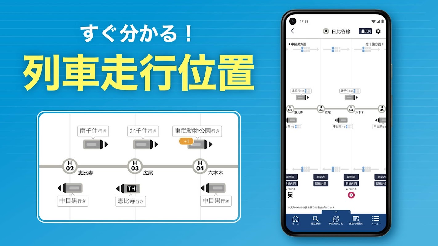 Este é o aplicativo oficial gratuito do Metrô de Tóquio. Ele exibe informações de operação e posições dos trens para as linhas do Metrô de Tóquio e do Metrô Toei, informações de congestionamento em tempo real para cada vagão e permite a busca de rotas combinando diversos meios de transporte, como trens, táxis, bicicletas compartilhadas e ônibus comunitários.