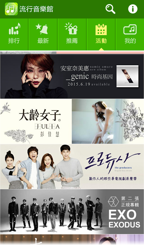 不論是周杰倫周杰伦、a MEI、林俊傑、排行榜新曲、熱門韓劇、各大音源榜KPOP(TWICE、BTS、EXO)、oricon公信榜、TOP西洋告示牌新曲、台語(玖壹壹、伍佰)、經典國語歌曲、懷舊老歌、民謠、抒情、電影原聲帶、 偶像劇、節奏 EDM*...等 ,