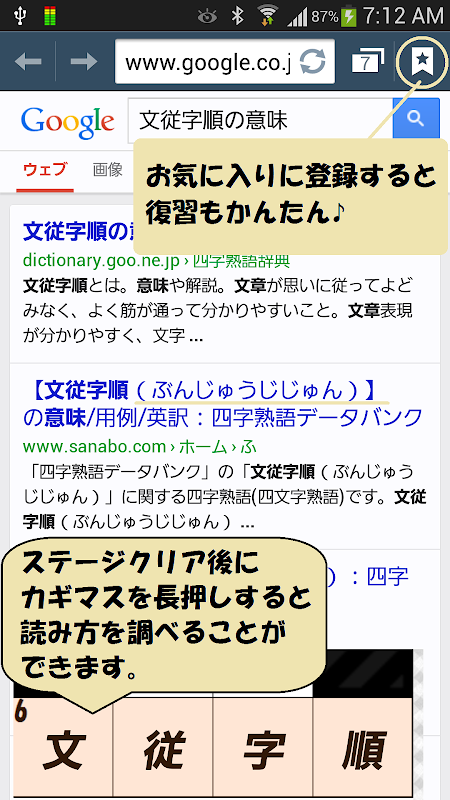 (1)クリア後に二字、四字熟語の意味を検索可能