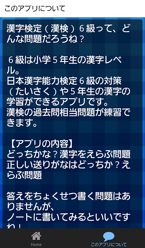 日本漢字能力検定6級の対策(たいさく)や5年生の漢字の学習ができるアプリです。