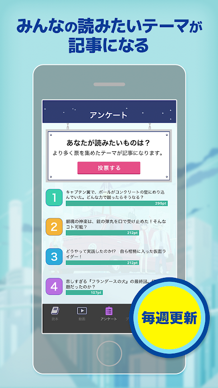 毎週アンケートを実施し、人気のあったテーマを次週に配信します。