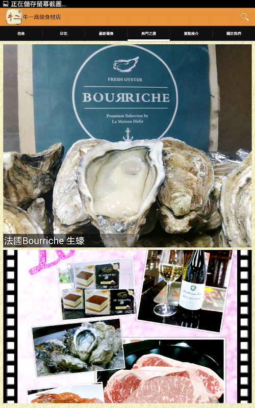 牛一高級食材店 Android 手機程式 (Apps), 介紹牛一高級食材店的產品如精選生蠔, 特色刺身/海鮮及優質肉類, 最新推廣及 店舖資料等.