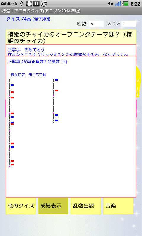 クイズの成績をファイルに保存でき、各設問の正解状況を表示することもできます!