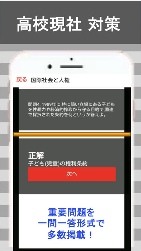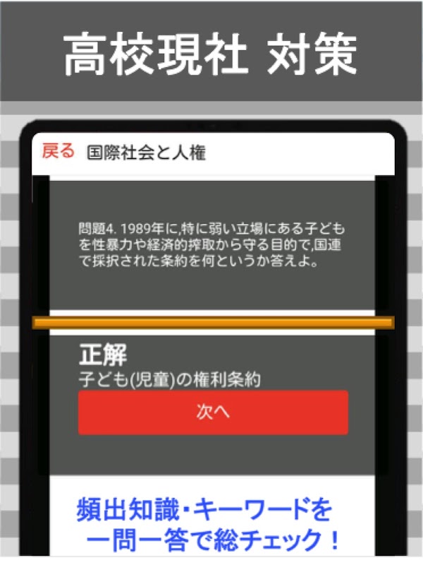 高校 公民「現社」に関する大量の知識をアプリで克服!授業の復習用からセンター試験まで、合格に必要な知識問題を厳選!知識の総チェック&弱点克服に最適です!
