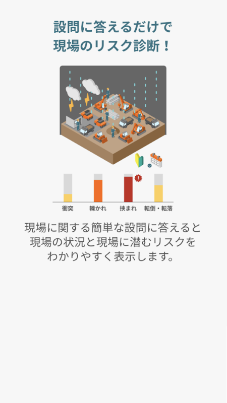 Ao responder a perguntas simples sobre o local e o trabalho, é realizado o diagnóstico de risco do local, e a situação do local e os riscos ocultos nele são exibidos de maneira fácil de entender.