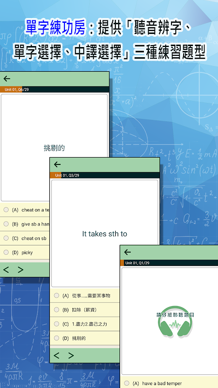 [Sala de prática de um único caractere]: Fornece três tipos de questões práticas: "ouvir para distinguir caracteres", "perguntas de múltipla escolha com uma única palavra" e "perguntas de múltipla escolha sobre tradução chinesa" para melhorar os resultados do aprendizado.