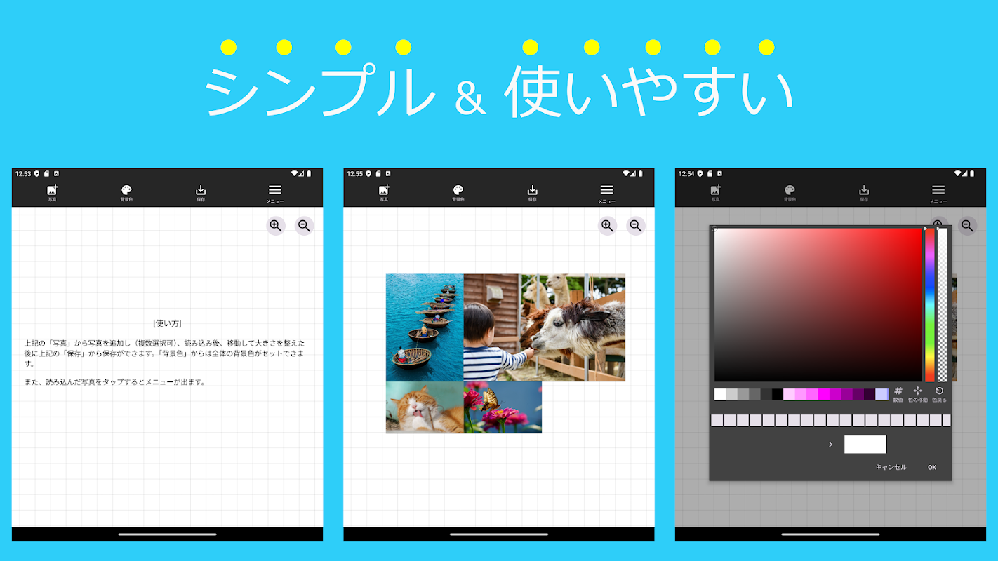 Fácil de usar. Primeiro, selecione uma foto (você pode selecionar mais de uma), mova-a e redimensione-a, defina a cor de fundo de sua preferência, selecione o tamanho para salvar e salve!
