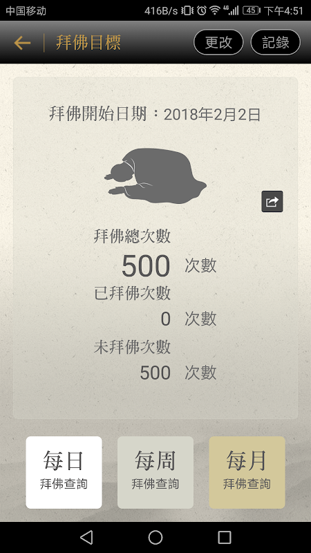 2.APPS 需要設置拜佛的目標,每次拜佛的記錄會慢慢累積達到目標。每次的拜佛記錄和目標記錄都會記錄下來, 使用者可有系統地紀錄下自己的拜佛次數.