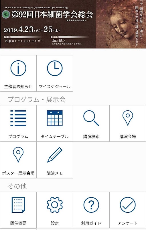 É um aplicativo oficial da reunião que pode visualizar as informações da palestra da 92ª Reunião Geral da Sociedade Japonesa de Bacteriologia.