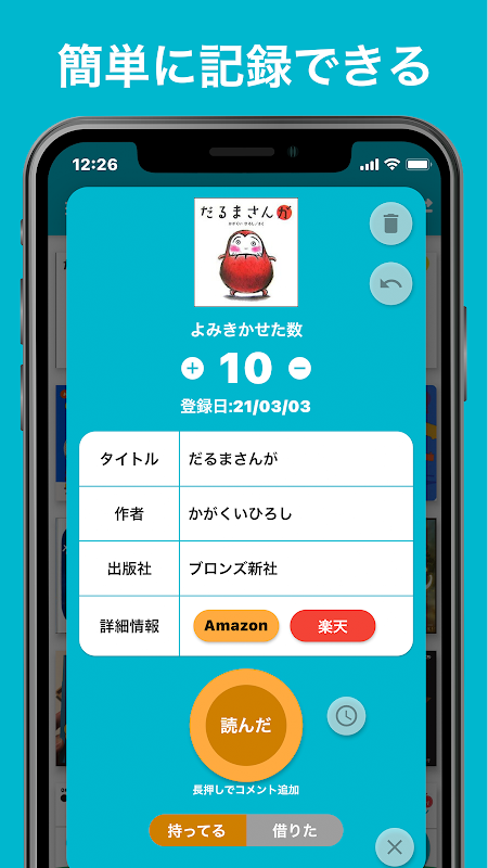 Para cada livro ilustrado, você pode contar o número de vezes que o leu apenas pressionando um botão. Além de simplesmente contar, você pode alterar a data pressionando e segurando o botão de leitura e também pode fazer anotações em 5 níveis de brincadeira, reações das crianças, etc. As contagens de leitura em voz alta são agregadas e exibidas em um gráfico.