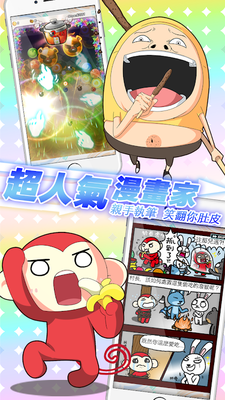 首創漫畫主題關卡設計,特別邀請FB人氣漫畫家「囂搞、救客人、輔大猴、好人信、鼻妹、阿囧‧囧囧子」,親筆繪製KUSO漫畫,擊敗漫畫家BOSS就可看到精彩的結局唷!