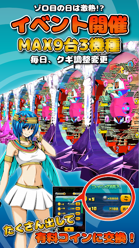 本物のホールのように全9台3機種のシマを毎日クギ調整し、簡単操作で興奮が体験できます。