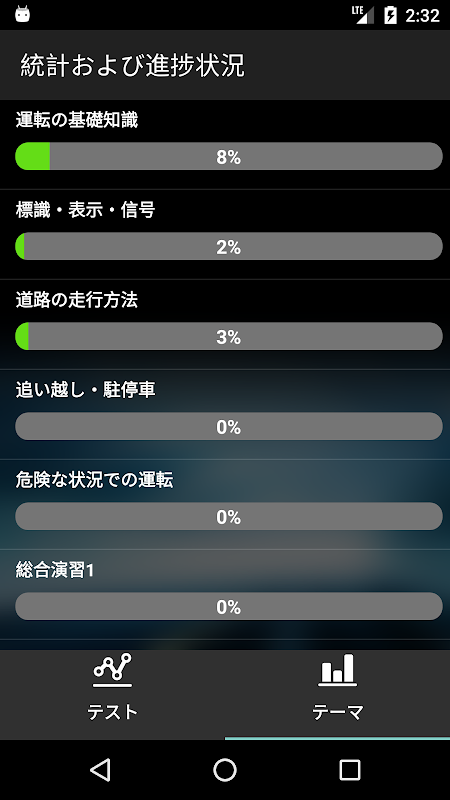このアプリケーションでは、既に行なった各テストだけでなく問題一つひとつについての履歴が保存されます。 各テーマごとに、これまで身につけた知識が全体の何パーセントに相当するのかを常に把握することができるので、最高の統計データを提供することになります。