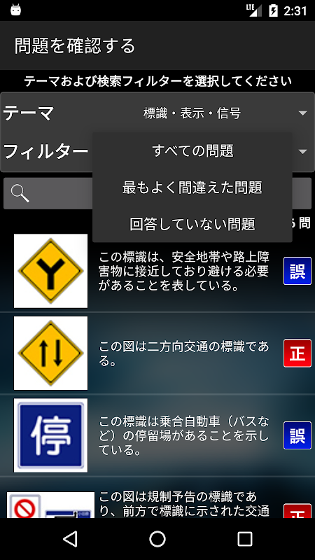 本番の学科試験を忠実に真似たシミュレーションテストを行うことができます。 テスト終了後間違えたところやすべての問題の解答を確認することが可能です。 合格するには10問中最低7 問正解する必要があります。