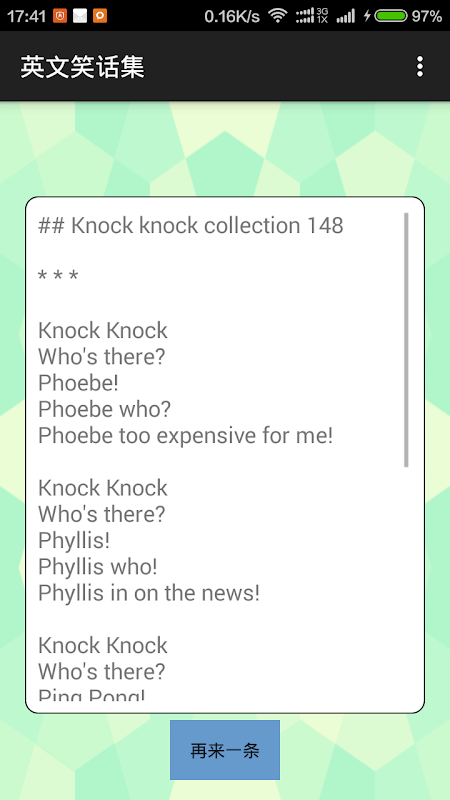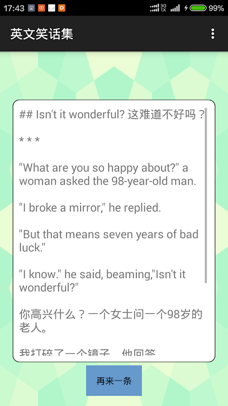 本app收集上网上流行的各种英文笑话,部分笑话带有中文的翻译。