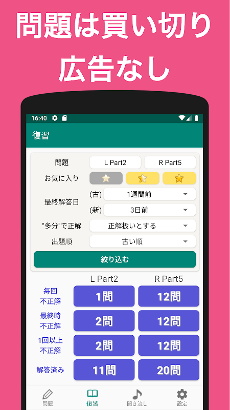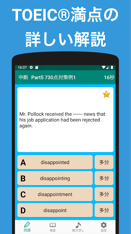Você pode prosseguir com seus estudos enquanto entende completamente cada questão, sem ser incomodado por explicações hostis ou japonês não natural que são comuns nos aplicativos de preparação para o teste TOEIC® L&R.