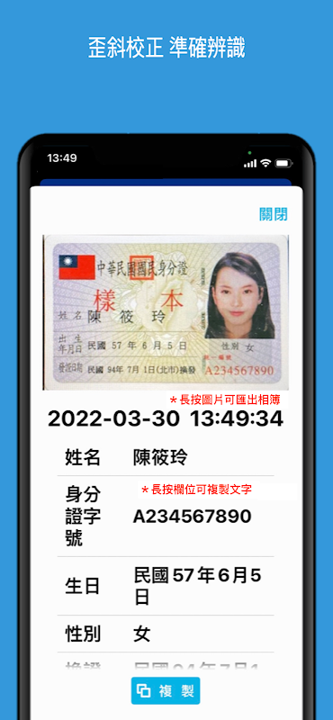 O ID Recognition APP é um programa de ferramenta avançado e prático, especialmente usado para reconhecimento de identidade, e converte carteiras de identidade, cartões de seguro saúde e outras carteiras de identidade em mensagens de texto e imagens para extração e uso.