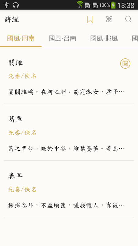 『诗经』的作者佚名,绝大部分已经无法考证,传为尹吉甫采集、孔子编订。『诗经』在先秦时期称为『诗』,或取其整数称『诗三百』。西汉时被尊为儒家经典,始称『诗经』,并沿用至今。诗经在内容上分为『风』、『雅』、『颂』三个部分。『风』是周代各地的歌谣;『雅』是周人的正声雅乐,又分『小雅』和『大雅』;『颂』是周王庭和贵族宗庙祭祀的乐歌,又分为『周颂』、『鲁颂』和『商颂』。
