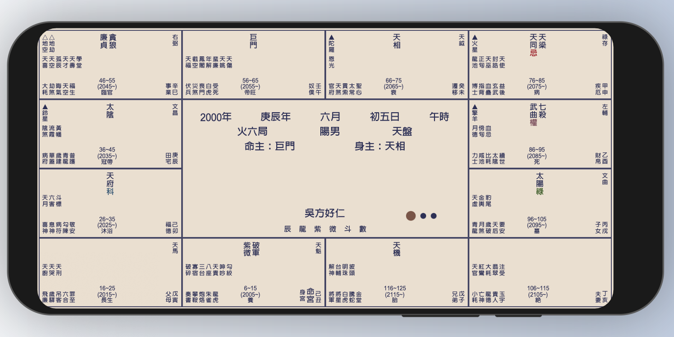 Este programa de layout foi projetado para o estilo Ziwei Dousu de Zhongzhou, herdado pelo Mestre Huang Mao do China Ziwei Doushu Center, e não é adequado para outras seitas Doushu.