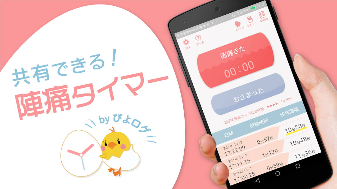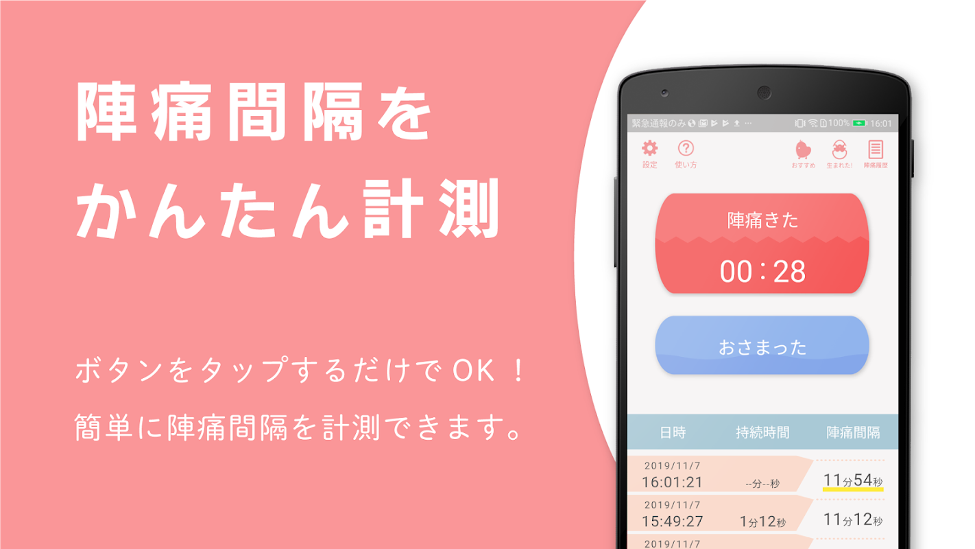 かんたん操作で陣痛間隔を記録できる無料陣痛計測アプリです!出産を控えた妊婦さんが安心して家族に陣痛を共有・通知できる妊娠中にお使いいただく出産準備ツールです。