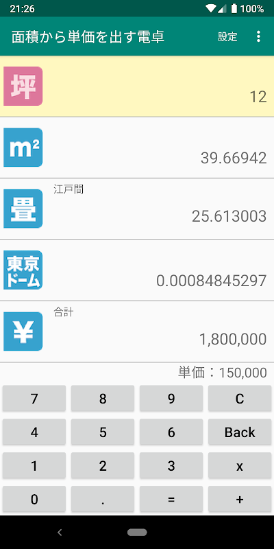 面積から単価を出す電卓 〜 広さと値段 1.0.2