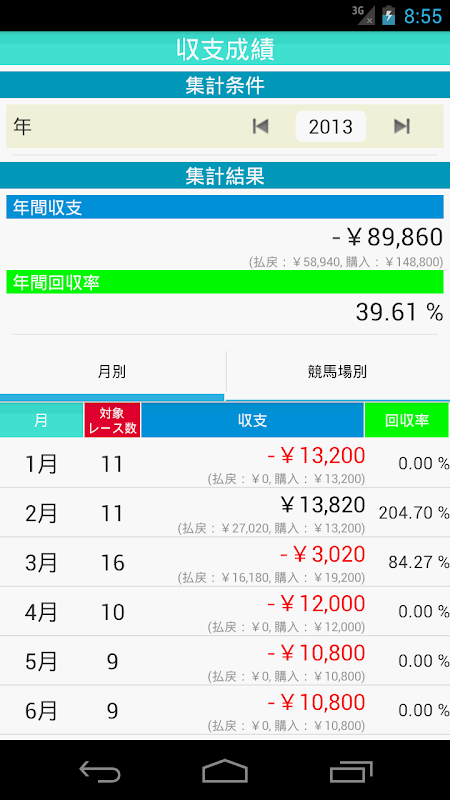 ・タブ画面により『月別』、『競馬場別』の表示が可能です。