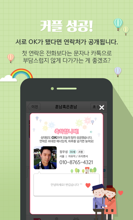 5. 매칭성공~!! 쌍방이 OK를 하게되면 이름과 연락처를 확인하고 데이트의 설레임을 기대합니다.
