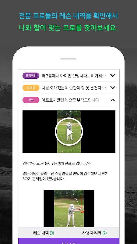 - 골프 스윙 자세 교정, 비거리 향상, 드라이버 잘치는 법, 골프그립 등 골프실력향상을 위해 영상을 등록하고 이어골프 프로님들에게 레슨을 받을 수 있는 메뉴입니다.