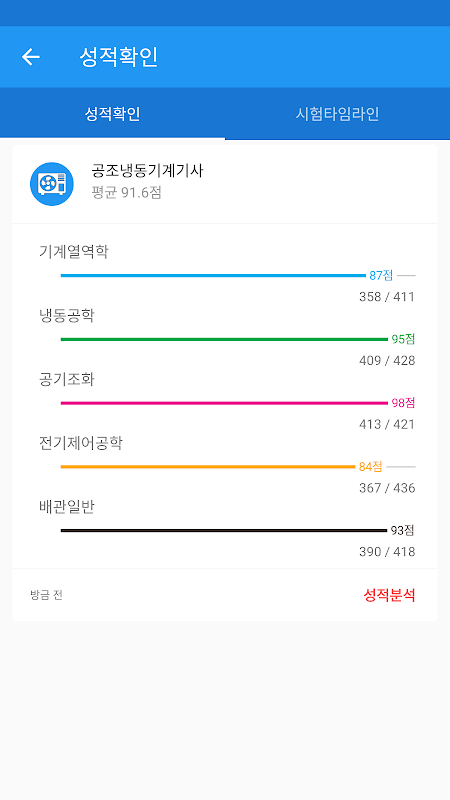 성적확인 - 각 과목별 성적 및 그동안 풀어본 기출문제와 모의고사, 문제풀기의 성적을 볼 수 있습니다.