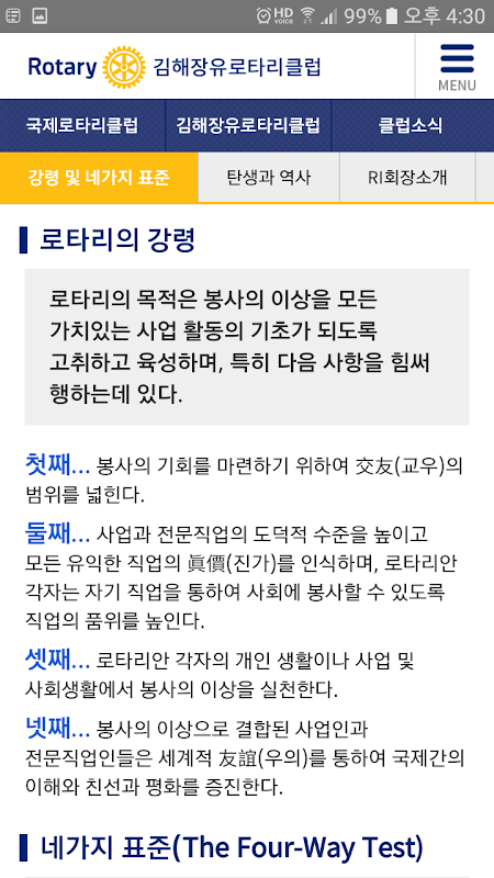 넷째. 봉사의 이상으로 결합된 사업인과 전문직업인들은 세계적 友誼(우의)를 통하여 국제간의 이해와 친선과 평화를 증진한다.