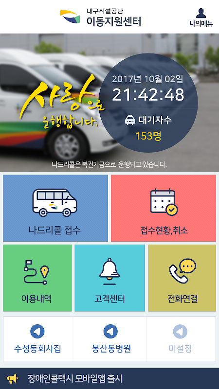 나드리콜은 2009년부터 운영중인 대구광역시 교통약자 특별교통수단으로, 대구시설공단에서 위탁 운영중에 있습니다.