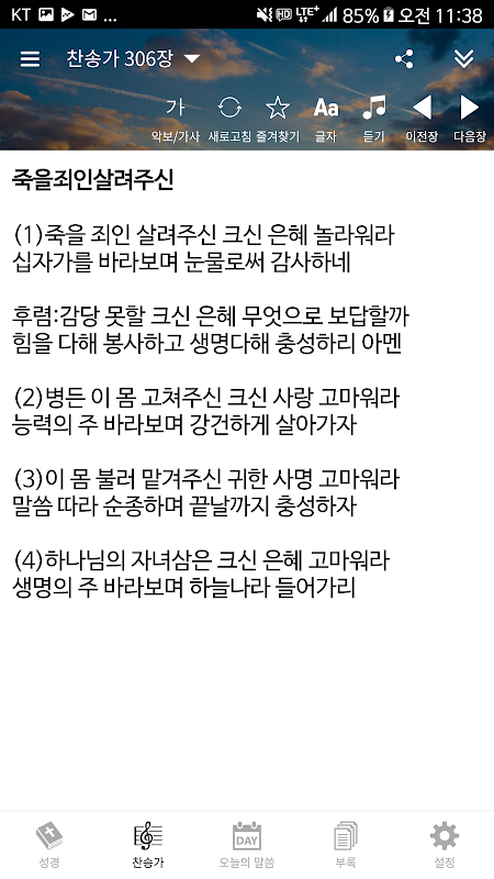 - 상단의 '음표'모양을 누르면 하단에 찬송가를 들을 수 있는 메뉴가 나와 들어볼 수 있습니다.