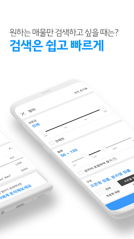 아파트, 신축분양부터 빌라·투룸+, 원룸, 오피스텔·도시형생활주택까지, 취향과 조건에 맞추어 제공되는 완벽한 맞춤형 서비스를 이용해보세요.
