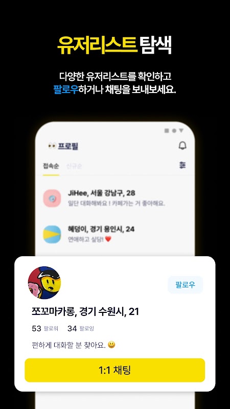 Na tela inicial principal, você pode verificar a lista de usuários que estão atualmente inscritos no aplicativo. Você pode verificar a lista de usuários, seguir as pessoas que você gosta ou enviar um chat.