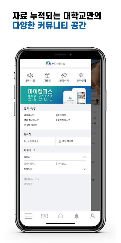 마이캠퍼스는 대학생 커뮤니티 및 동아리 활동 공간과 지역 대학 상권 정보를 언제나 쉽게 찾을 수 있게 도와주는 어플리케이션입니다.